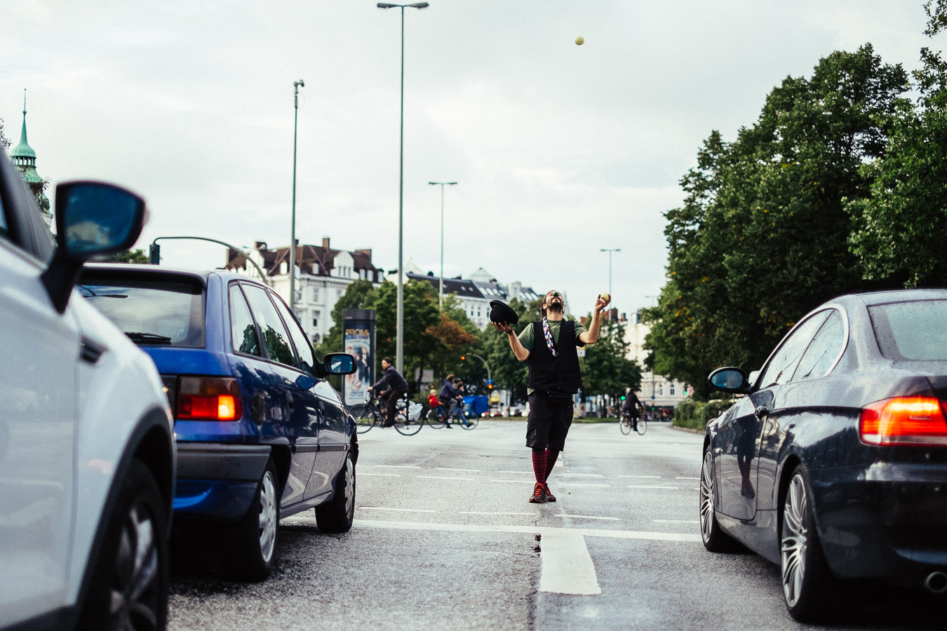 Gestern sah ich zufälligerweise Michali an der Ampel durch Jonglage Autofahrer bei Rotlicht unterhalten. Da musste ich natürlich meine Kamera zücken …