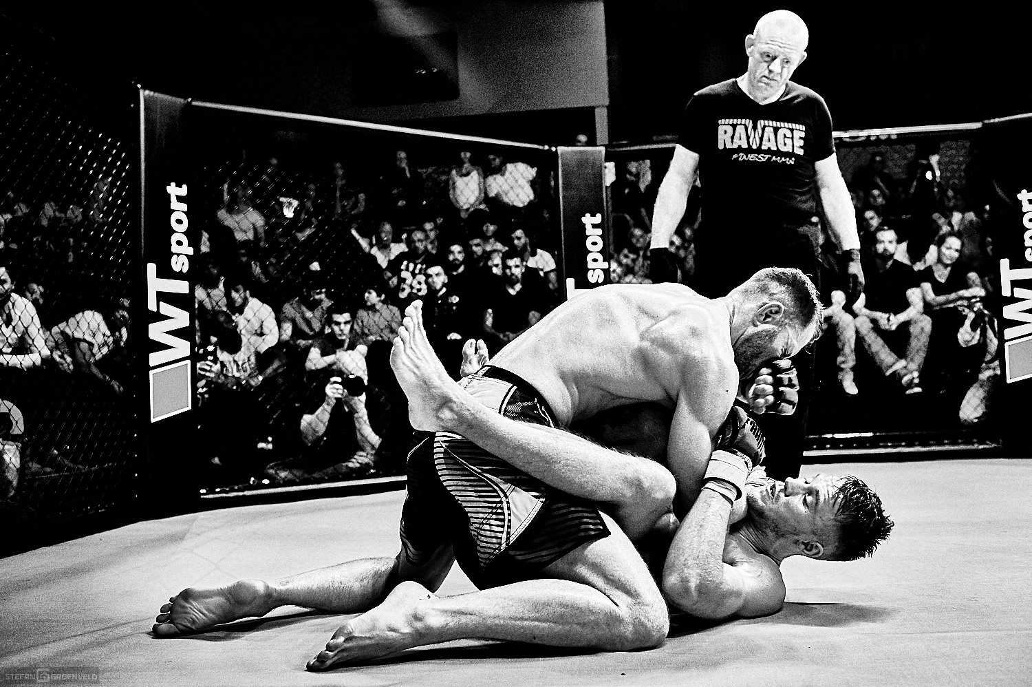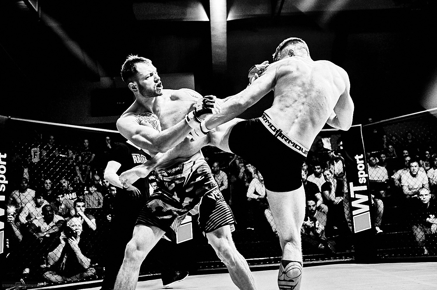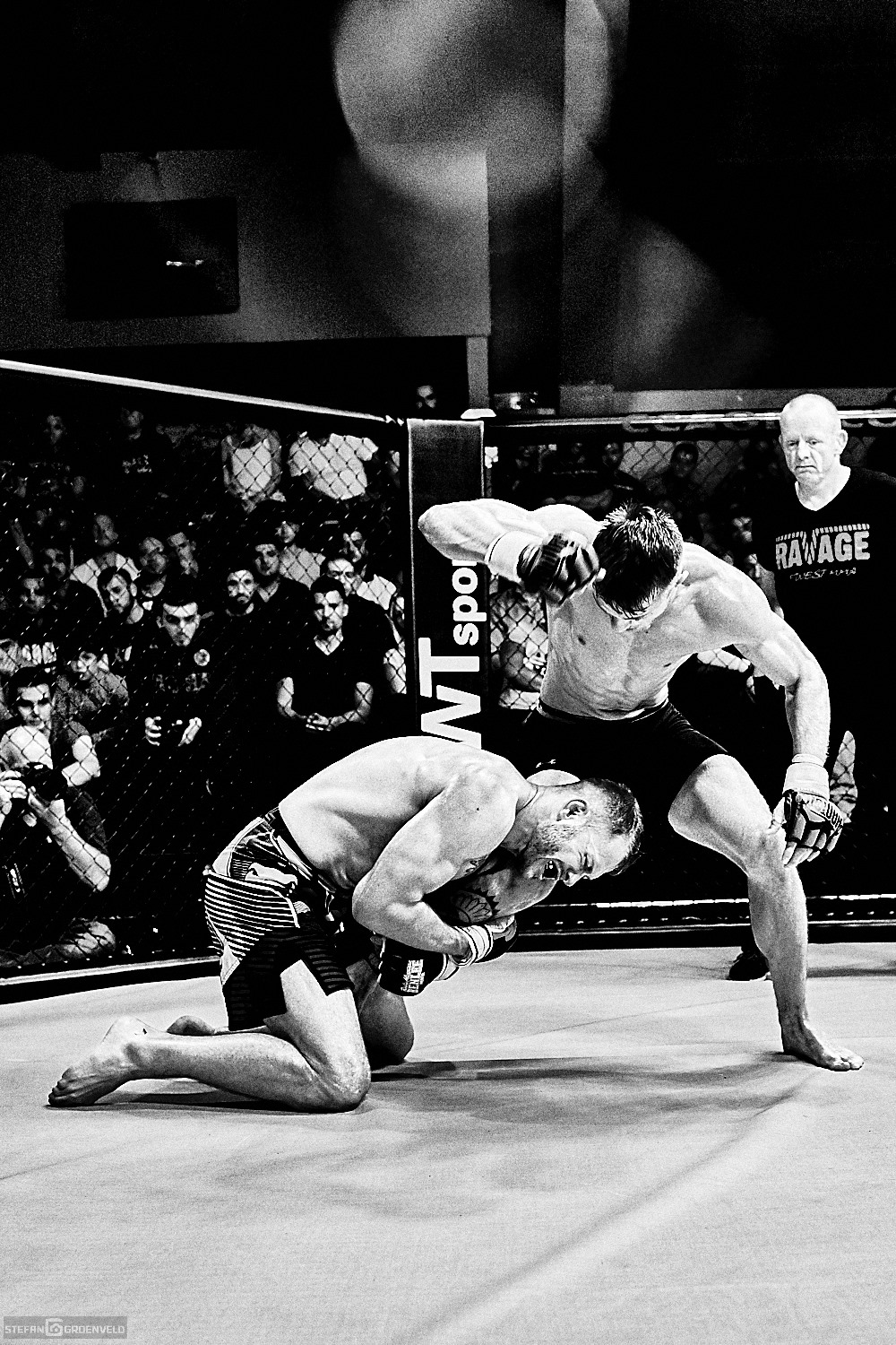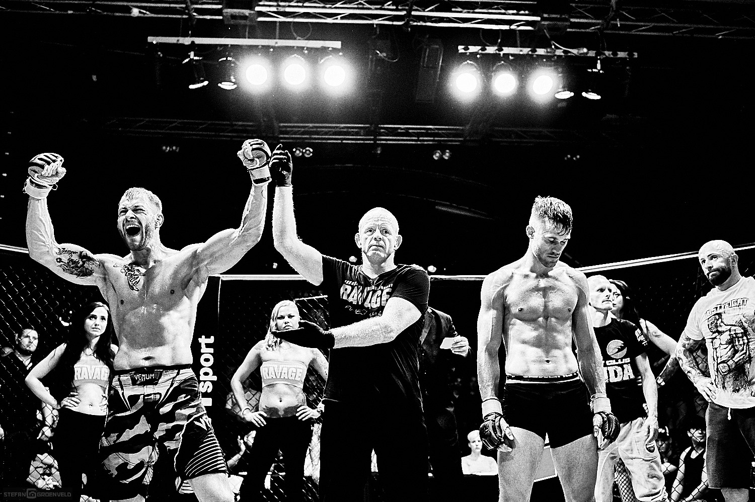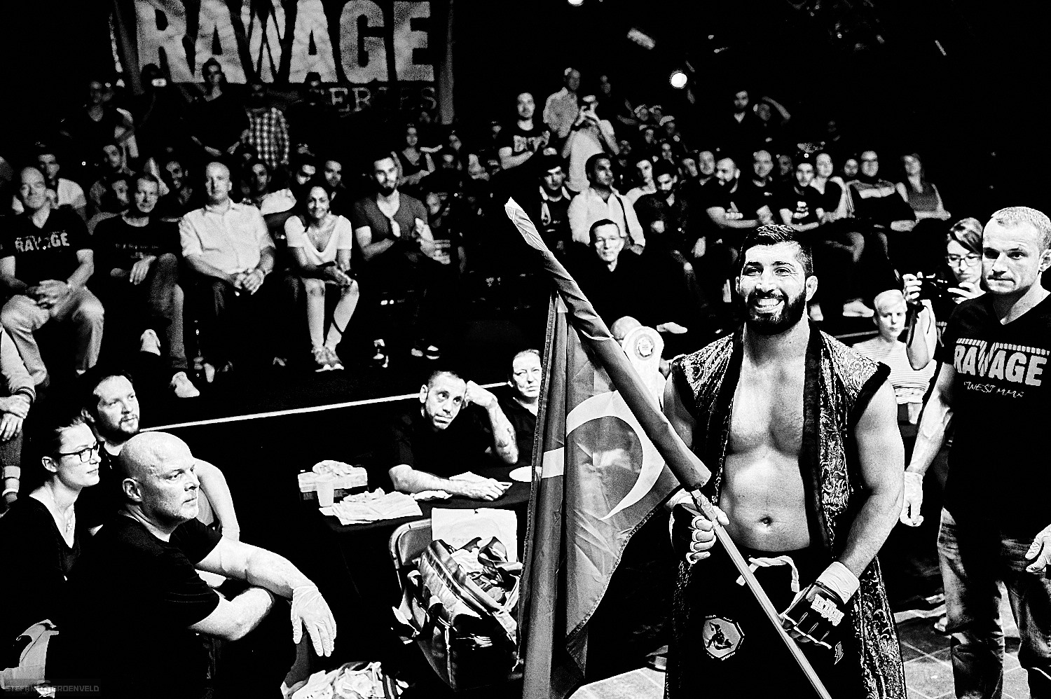 Für mich war es die erste MMA Veranstaltung als Fotograf am Fight-Cage und ich muss sagen, ich bin immer noch geflasht. Ich habe ja ein Herz für ehrlichen Kampfsport und bin gerne bei Muay Thai Veranstaltungen am Ring, aber MMA ist eine ganz andere Nummer. Zwar hatte ich mir vorher Videos angeschaut, aber so live und direkt ist es der Hammer. Ich weiß gar nicht, wo ich anfangen soll. Vielleicht damit, dass die Markthalle als Austragungsort für die neue Ravage Serie ein super nahes und mitreissendes Erlebnis ermöglichte. Manchmal hatte ich das Gefühl, dass der Cage als ein Schutz der Kämpfer für die überbordende Freude der Fans diente. Allerdings waren die Kampf-Paarungen auch sehr gut und gleichmäßig besetzt. Das sorgte für Kämpfe auf packendem Niveau.