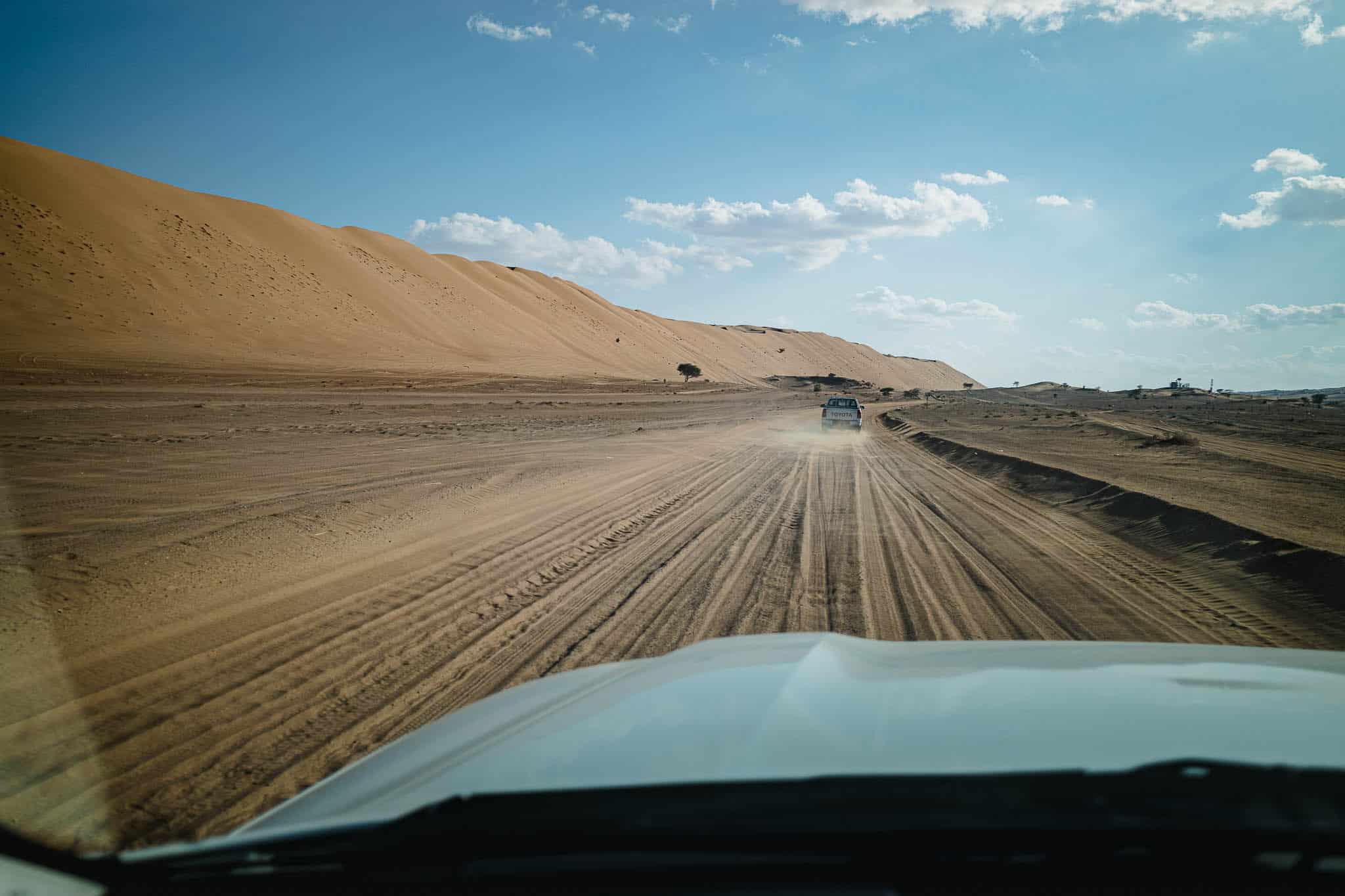 A visit to Wahiba Sands is fully organized in terms of tourism. On the main road from which the sandy slopes branch off into the desert camps, there is a gas station where red-faced whites wait for their guide and a super-friendly gas station attendant who brings the tires of your car to the correct tire pressure. He asked us which camp we were going to and then said that we didn’t need a tour guide for the trip there, because it would be signposted and only go straight ahead. It’s the closest resort anyway. 20 minutes later we drive behind a guide on sand for the first time at 80 kilometers an hour and laugh out loud when we discover a small signpost to the camp between a lot of sand. We’re Northern Europeans …