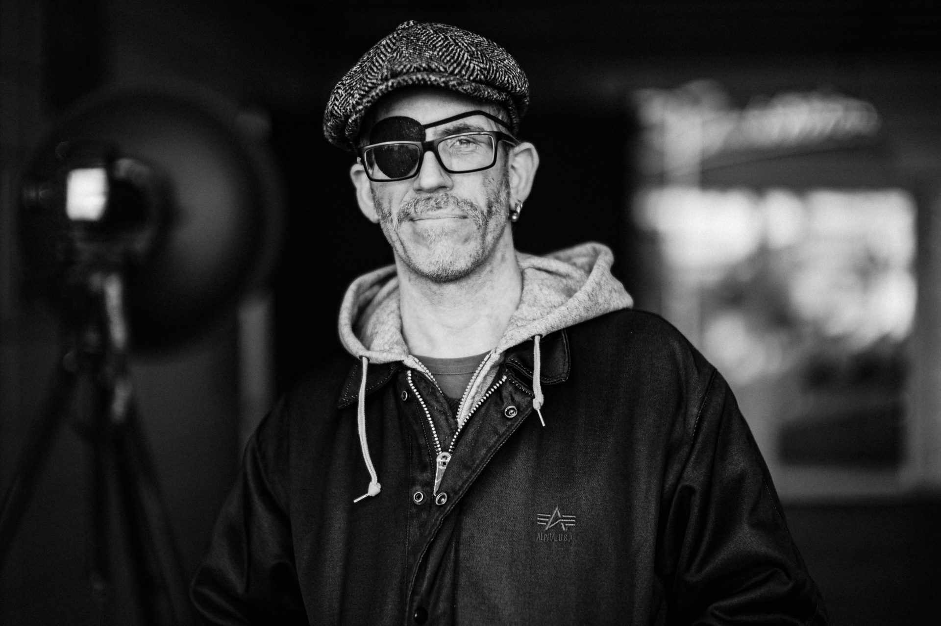 Glücklicherweise konnte ich Andreas im Anschluss an seinen Fotoshoot dann noch schnell zu einem Gegenschuss überreden. Und das trotz seiner unüblichen Augenklappe, die er wegen einer Entzündung sicherheitshalber trug. Mittlerweile geht es seinem Auge auch wieder besser. Meinen Schnellschuss siehst du oben am Anfang des Artikels. Ich habe mein Bild als Hommage an seine Serie gleich in schwarz-weiß mit meiner Leica Monochrom fotografiert. Und im Hintergrund siehst du auch noch das improvisierte Fotostudio on Location mitten auf St. Pauli.