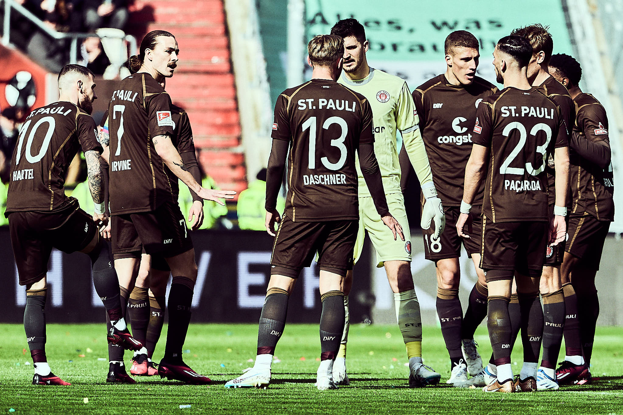 Nach zehn Minuten werden sich die meisten Zuschauerinnen im Millerntor die Augen gerieben haben. Kurzfristig stand es da schon 0:2 und Kapitän Irvine holt sich sein Team zusammen. Die Fokussierung hat in den ersten Minuten komplett gefehlt. Glücklicherweise stand der Weiß-Grüne Ache bei seinem zweiten Schuss aufs Tor im Abseits. Es blieb beim 0:1 und die Fokussierung stimmte bei den Braun-Weissen wieder. Der Ausgleich gelang Manolis Saliakas verdient kurz danach. Oladapo Afolayan hatte mal wieder artistisch mit dem Aussenrist zu Irvine gepasst, der den Ball zum Torschützen weiterleitete.