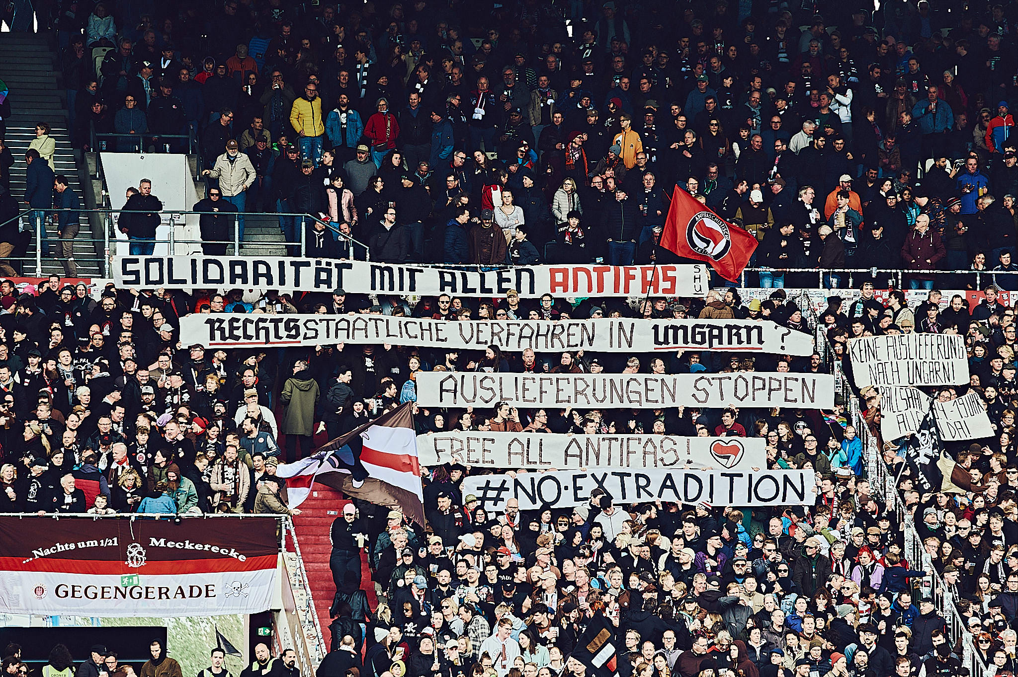 Zu Beginn der zweiten Halbzeit machte Gegengerade und Nord auf eine zu befürchtende Auslieferung einiger Menschen nach Ungarn und eine Veranstaltung dazu am 18.4. aufmerksam.