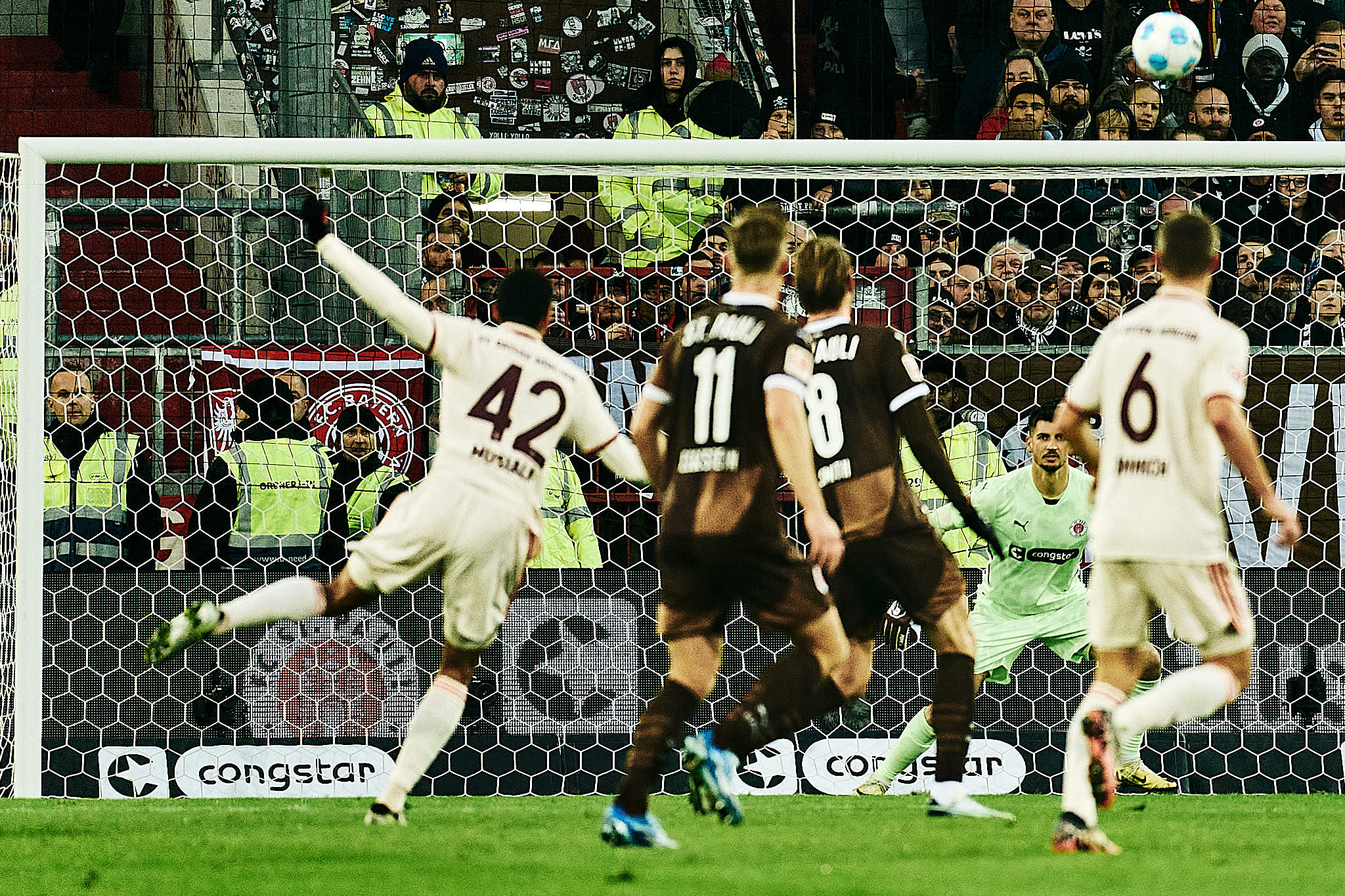 Die erste Viertelstunde läuft noch ganz gut für braun-weiß. Auch zwischendurch kann sich der FC St. Pauli hin und wieder mal vorne festsetzen. Insgesamt passiert das natürlich zu selten. Der FC Bayern München erreicht grob 75% Ballbesitz. Der Tabellenführer ist sehr schnell, läuft viel, rochiert die Positionen durch und hat Musiala. Der trifft in der 23. Minute sehr sehenswert aus grob 20 Meter zum 1:0. Diese Schusstechnik sieht man nicht oft am Millerntor.