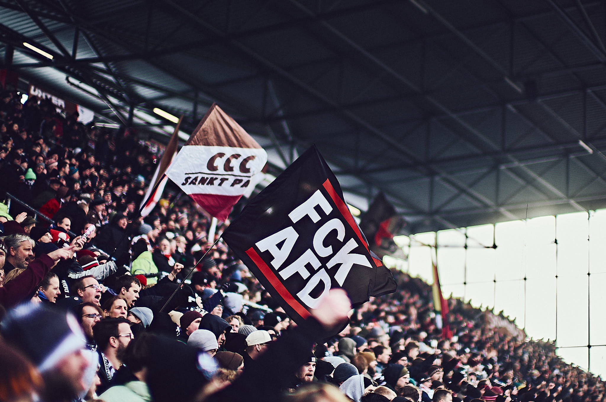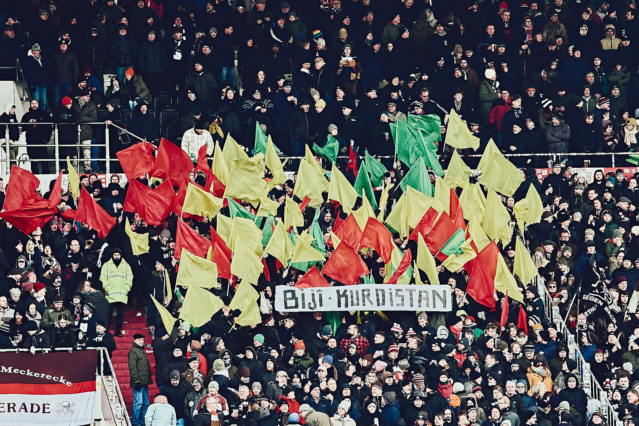 Ich bin immer wieder überrascht, wie unterschiedlich die Temperaturen im Stadion sind. Die erste Halbzeit saß ich im Schatten vor der Süd und es fühlte sich deutlich wärmer als in der zweiten Halbzeit in der Sonne vor der Nord an. Der Wind pfeift auf und vor der Nord einfach so unangenehm wegen der beiden offenen Ecken durch das Millerntor–das macht schon ein paar Grad bei der gefühlten Temperatur aus.
