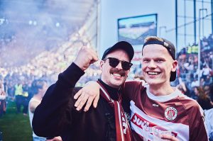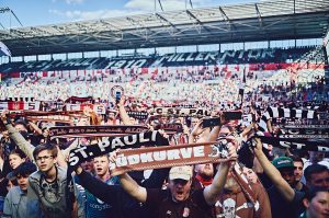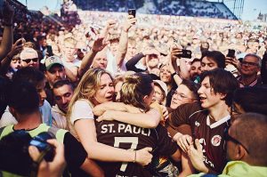 Vor dem Aufstieg musste erst noch ein Spiel gegen Osnabrück über die Runden gebracht werden. Ohne despektierlich wirken zu wollen, habe ich niemanden getroffen, der oder die an den für den Aufstieg notwendigen Punkt gegen den Tabellenletzten gezweifelt hätte. Der Verein hatte sogar entsprechend vorgesorgt und die Werbebanden vor der Gegengerade nicht aufgebaut. Gerüchten zur Folge hat der Platzsturm in Leverkusen einige Millionen gekostet, weil die Banden zu Bruch gingen. Dieses Geld hat der Kiezclub natürlich nicht. Für mich hatte das den Vorteil, dass mehr Platz für schönere Perspektiven vorhanden war. Auch wenn diese Bilder heute vermutlich niemanden interessieren.