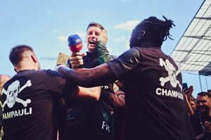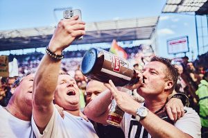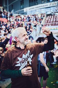Ab der 78. Minute wurden die Tontechniker aktiv und räumten die Mikrophone weg. Dann kamen Fernsehmenschen mit Kameraequiment und der TV Kameramann von der Mittellinienkamera machte auch schon Feierabend. Ich packte meine Tasche und wollte diese irgendwo in Sicherheit bringen, dabei die Feierlichkeiten mit den Kameras um meine Schultern fotografieren. Da war es aber schon zu spät. Kein Durchkommen mehr. Es ist trotzdem überhaupt nichts passiert – außer dass ich fast umgerannt worden wäre. Eine wunderbare friedliche Atmosphäre lag über dem Platz und viel Ausgelassenheit war spürbar. Fabian Hürzeler wurde zum Sky Mikrophon getragen und die Bierdusche fand vor laufender Kamera statt. Dabei trinkt der Trainer gar kein Bier.