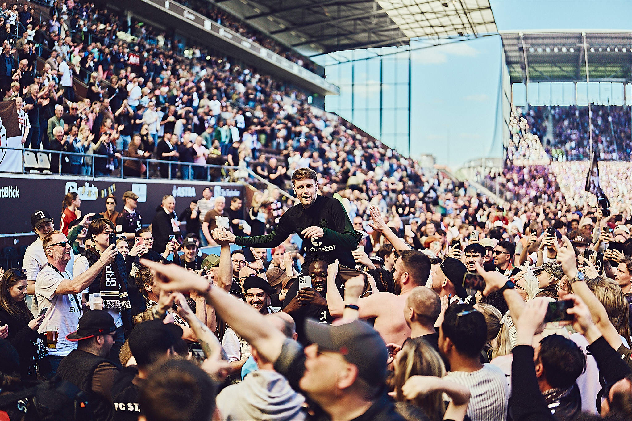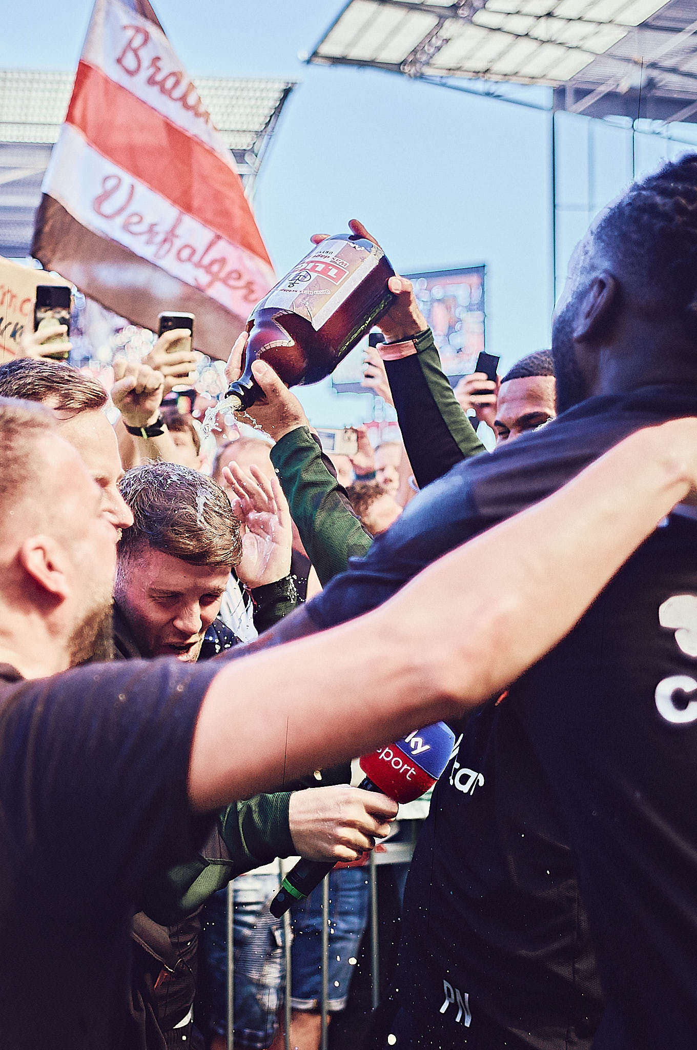 Ab der 78. Minute wurden die Tontechniker aktiv und räumten die Mikrophone weg. Dann kamen Fernsehmenschen mit Kameraequiment und der TV Kameramann von der Mittellinienkamera machte auch schon Feierabend. Ich packte meine Tasche und wollte diese irgendwo in Sicherheit bringen, dabei die Feierlichkeiten mit den Kameras um meine Schultern fotografieren. Da war es aber schon zu spät. Kein Durchkommen mehr. Es ist trotzdem überhaupt nichts passiert – außer dass ich fast umgerannt worden wäre. Eine wunderbare friedliche Atmosphäre lag über dem Platz und viel Ausgelassenheit war spürbar. Fabian Hürzeler wurde zum Sky Mikrophon getragen und die Bierdusche fand vor laufender Kamera statt. Dabei trinkt der Trainer gar kein Bier.