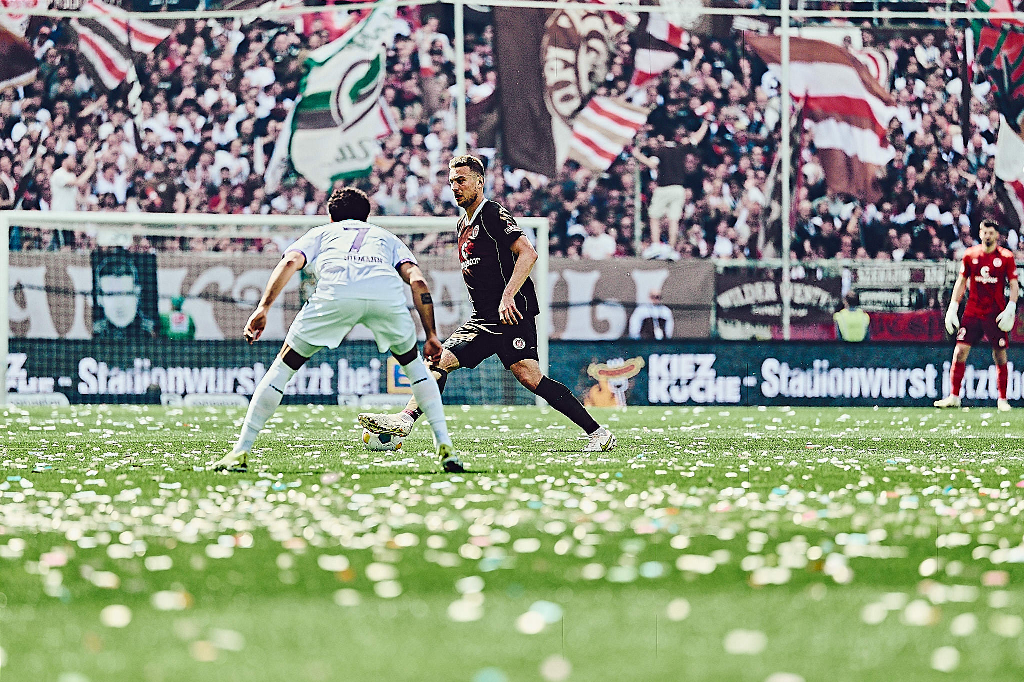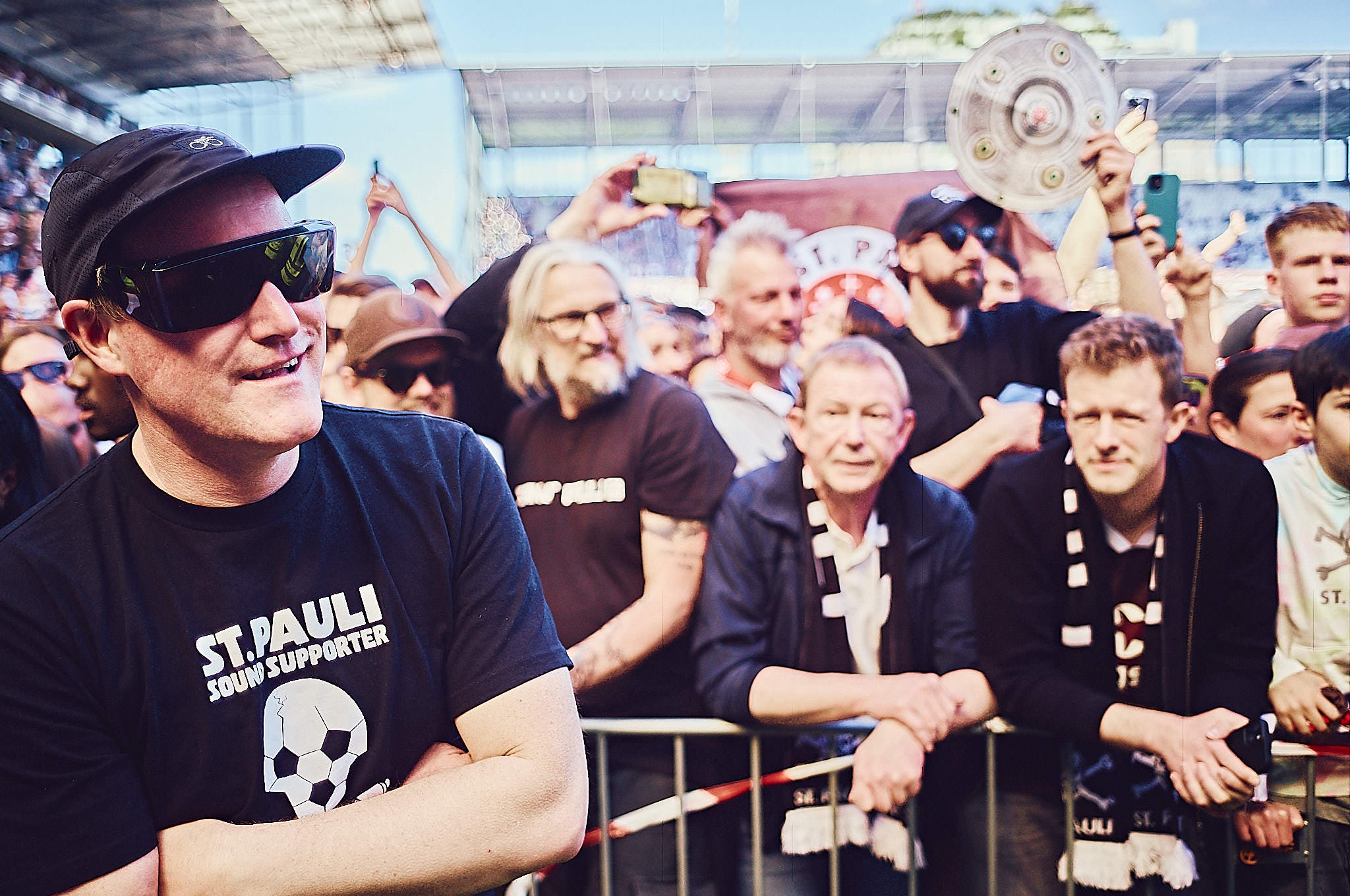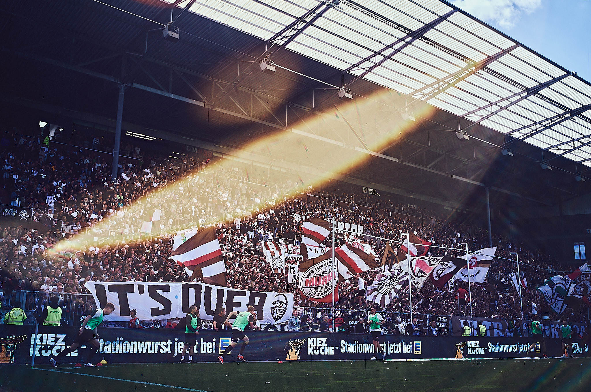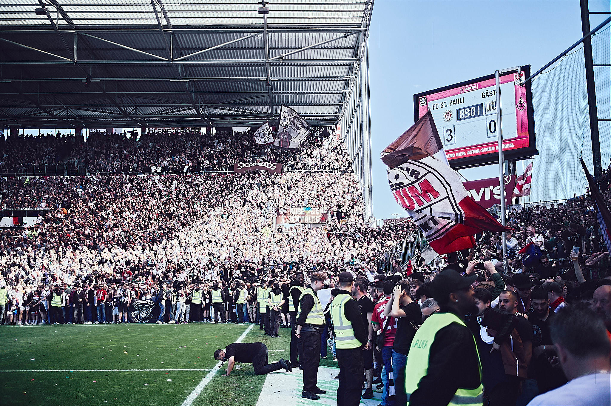 Vor dem Aufstieg musste erst noch ein Spiel gegen Osnabrück über die Runden gebracht werden. Ohne despektierlich wirken zu wollen, habe ich niemanden getroffen, der oder die an den für den Aufstieg notwendigen Punkt gegen den Tabellenletzten gezweifelt hätte. Der Verein hatte sogar entsprechend vorgesorgt und die Werbebanden vor der Gegengerade nicht aufgebaut. Gerüchten zur Folge hat der Platzsturm in Leverkusen einige Millionen gekostet, weil die Banden zu Bruch gingen. Dieses Geld hat der Kiezclub natürlich nicht. Für mich hatte das den Vorteil, dass mehr Platz für schönere Perspektiven vorhanden war. Auch wenn diese Bilder heute vermutlich niemanden interessieren.