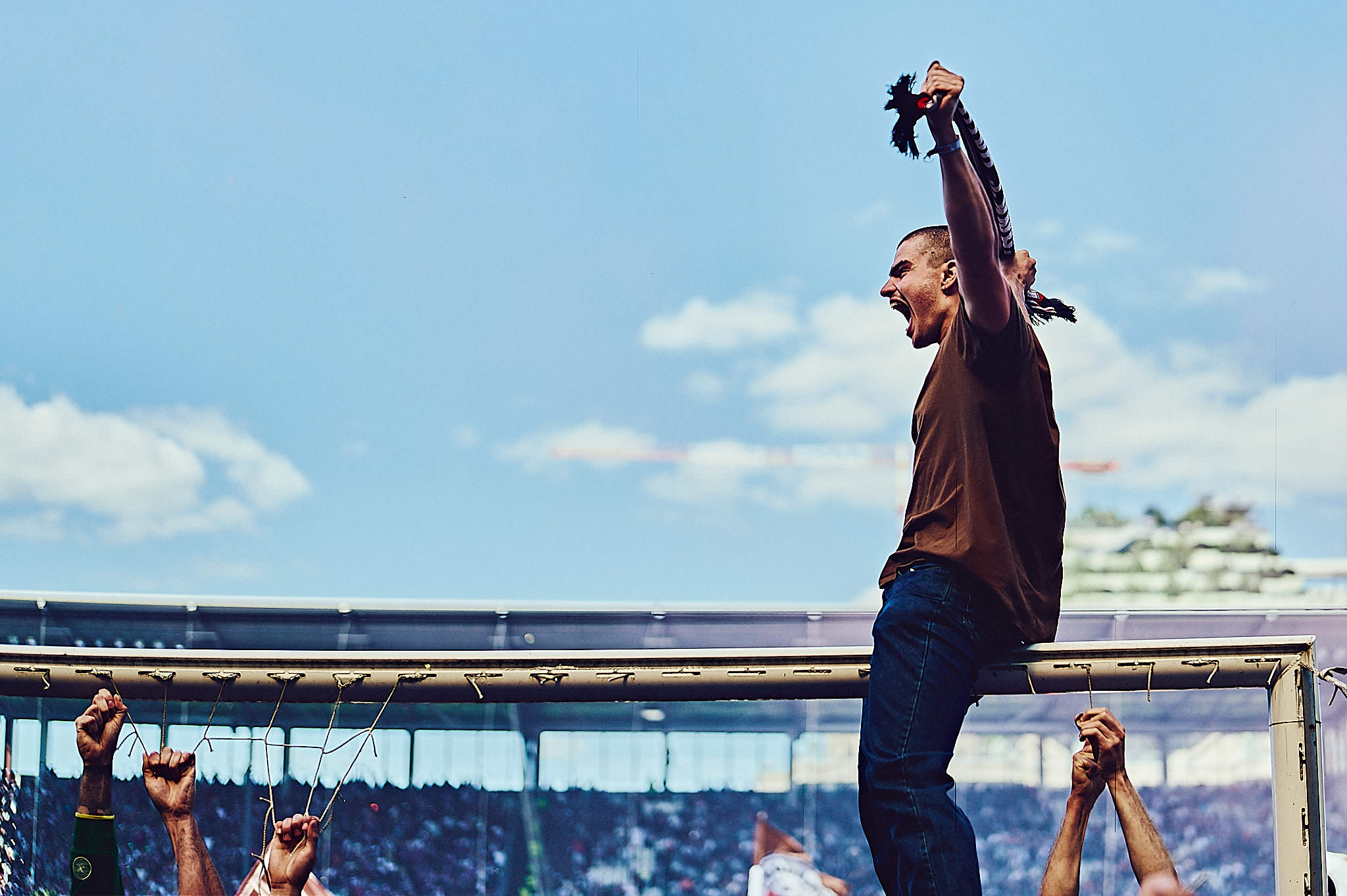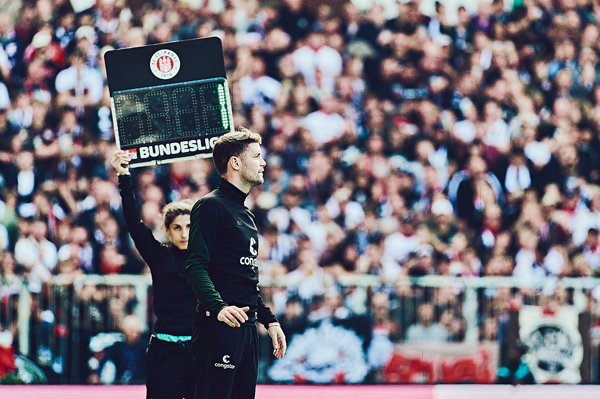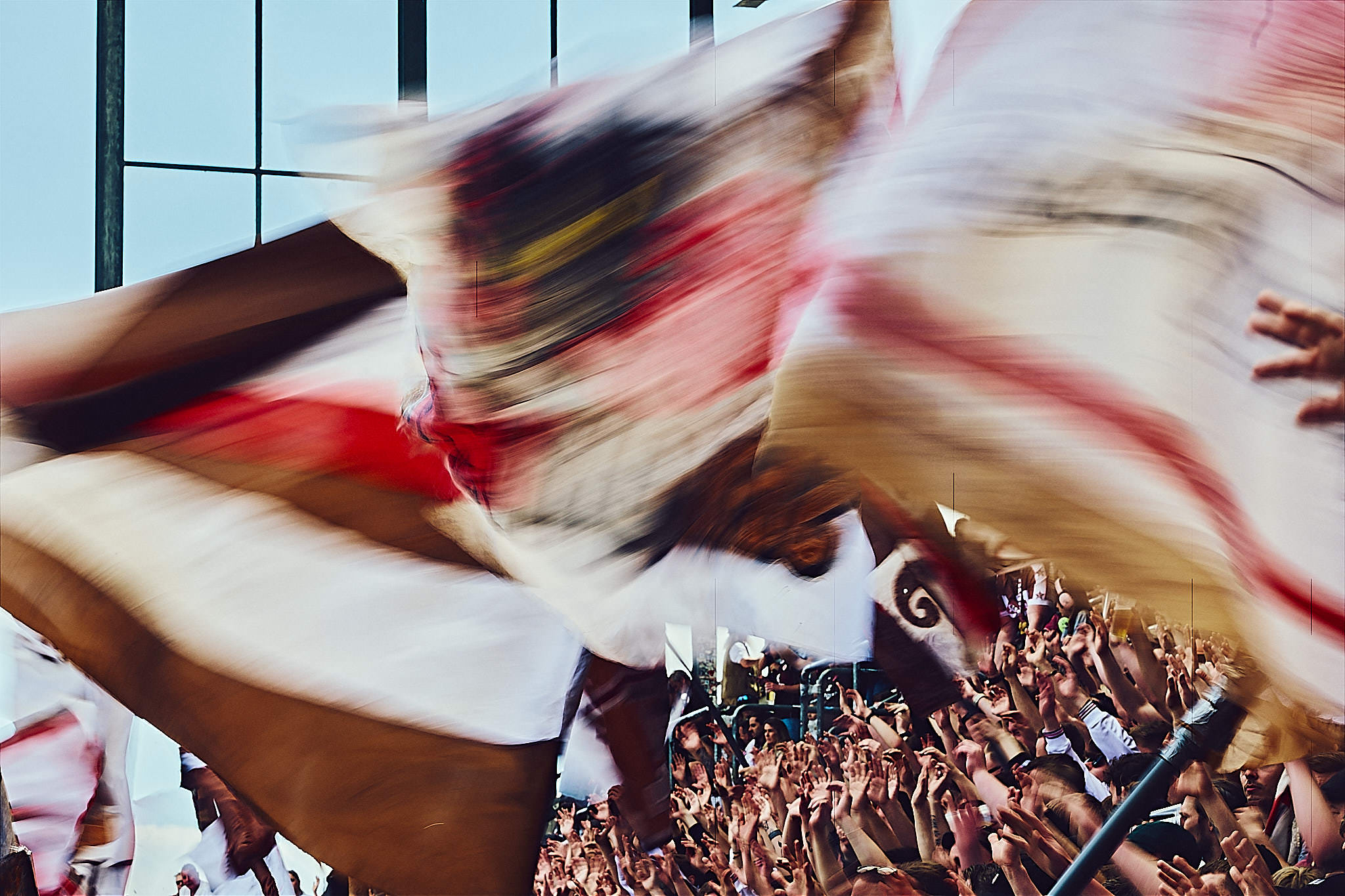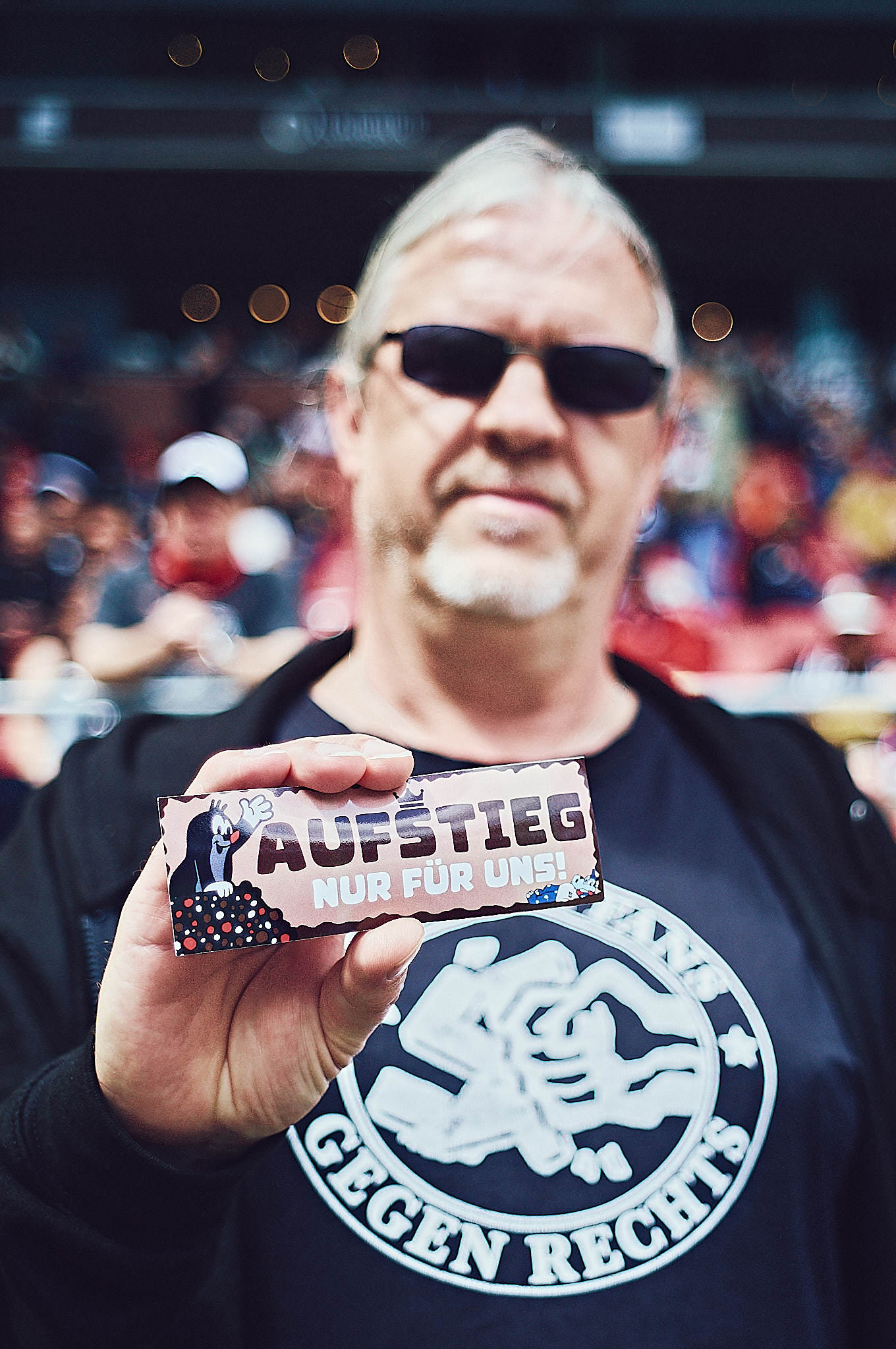 Vor dem Aufstieg musste erst noch ein Spiel gegen Osnabrück über die Runden gebracht werden. Ohne despektierlich wirken zu wollen, habe ich niemanden getroffen, der oder die an den für den Aufstieg notwendigen Punkt gegen den Tabellenletzten gezweifelt hätte. Der Verein hatte sogar entsprechend vorgesorgt und die Werbebanden vor der Gegengerade nicht aufgebaut. Gerüchten zur Folge hat der Platzsturm in Leverkusen einige Millionen gekostet, weil die Banden zu Bruch gingen. Dieses Geld hat der Kiezclub natürlich nicht. Für mich hatte das den Vorteil, dass mehr Platz für schönere Perspektiven vorhanden war. Auch wenn diese Bilder heute vermutlich niemanden interessieren.