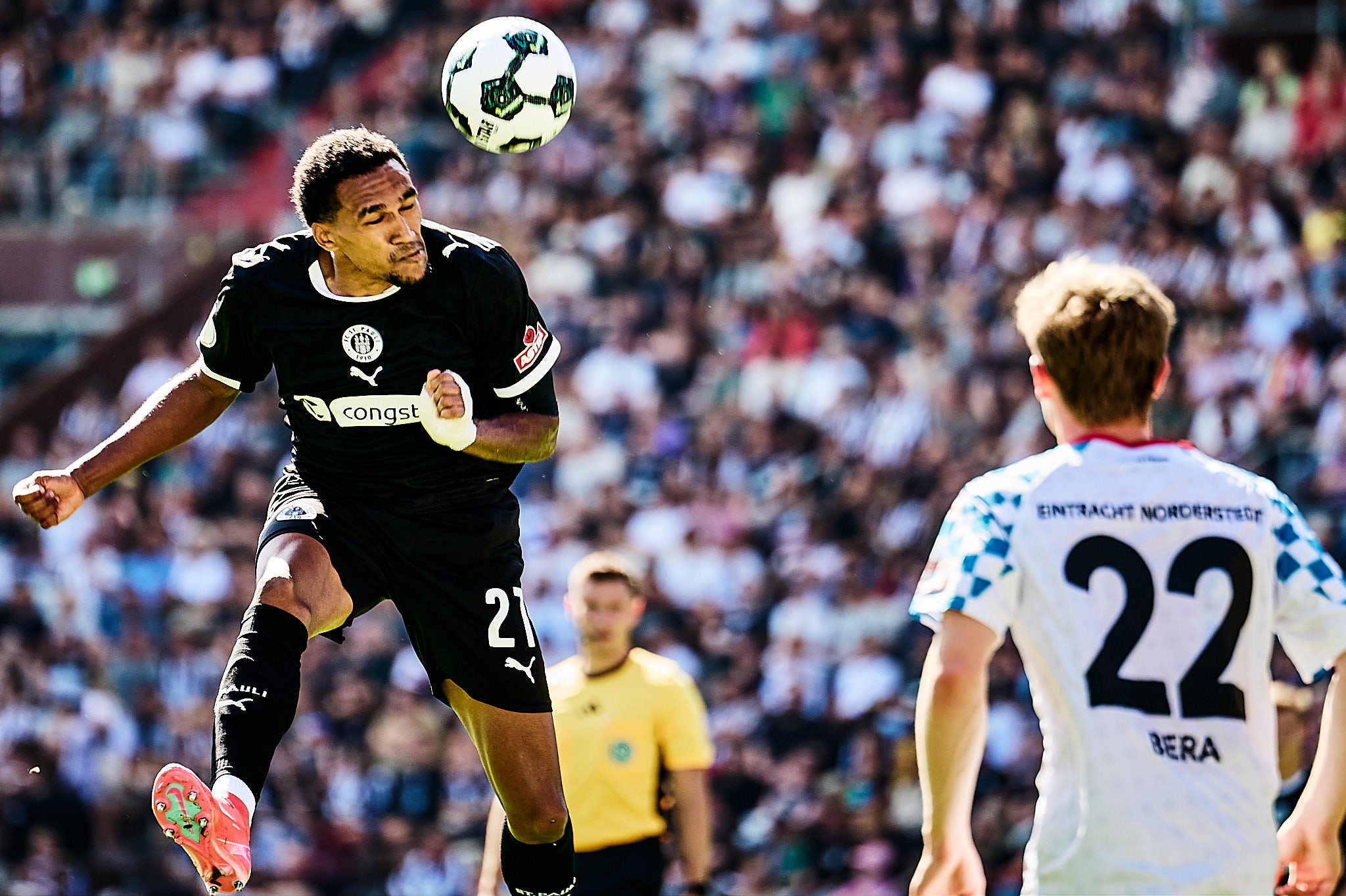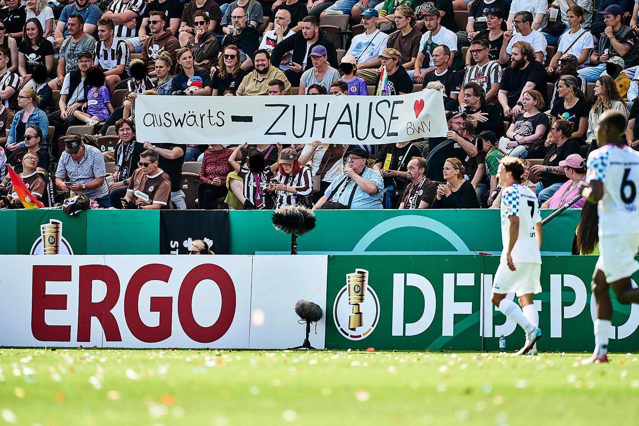 Im DFB-Pokal traf der Stadtnachbar aus Norderstedt in seinem Heimspiel auf den FC St. Pauli im Millerntor. Der Pokal hat eben seine eigenen Gesetze. Deswegen gab es auch andere Werbebanden, die leider noch höher waren, als sie es normalerweise schon sind. Das macht keine schönen Bilder – interessiert aber nur die Fotografinnen. Glücklicherweise gab es keine Banden vor der Gegengerade, weswegen die meisten dort saßen – ich auch.