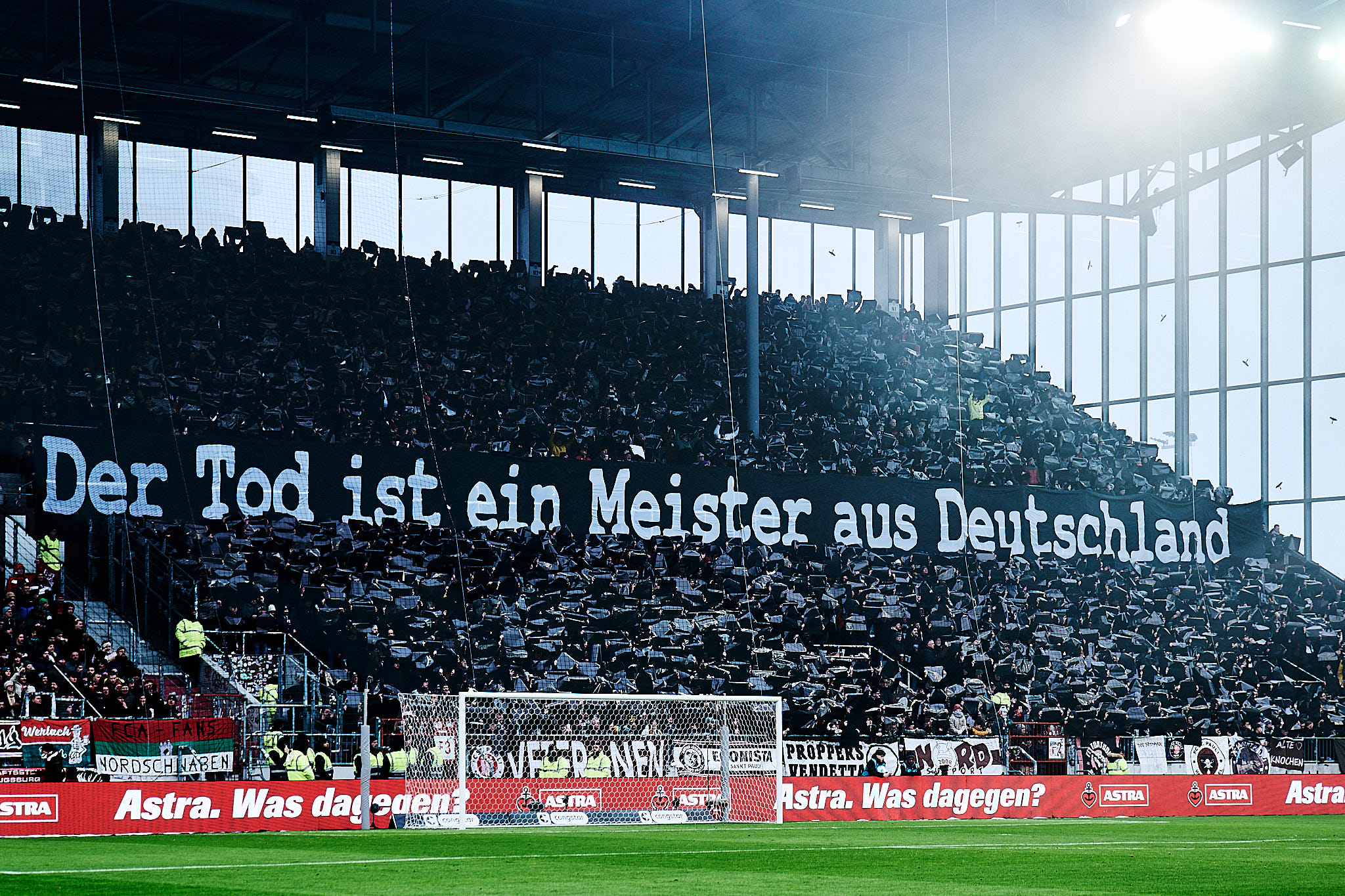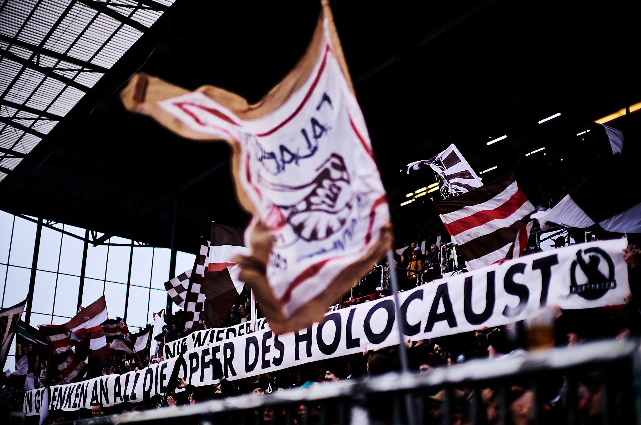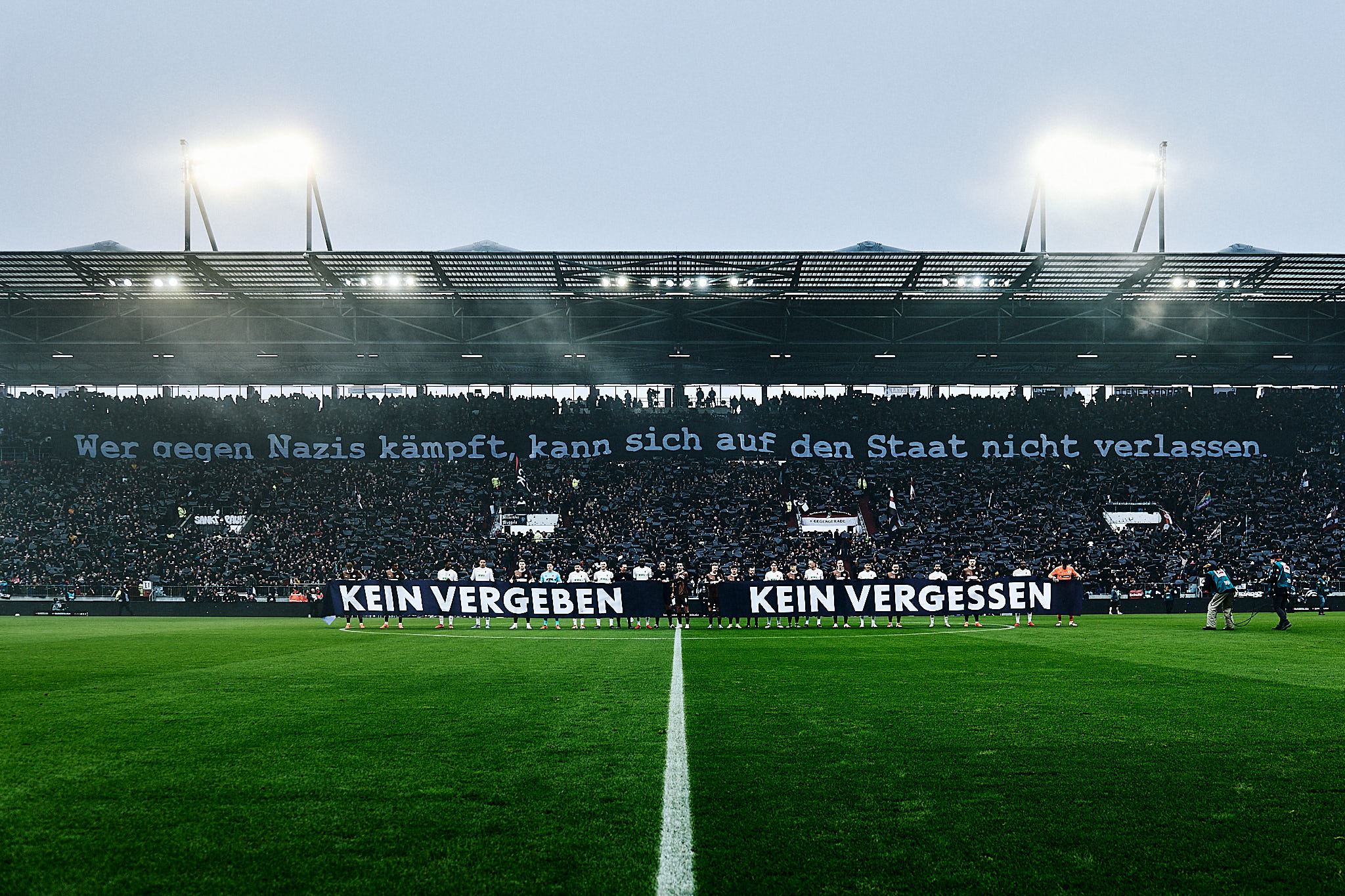 Aber fangen wir vorne an: gespenstische Stille als die beiden Teams den Rasen betreten. Wenige Tage nach dem 80. Gedenktag an die Befreiung der Menschen im Konzentrationslager Auschwitz erinnerte das Millerntor an den Holocaust und der Schreckensherrschaft der Nazis. Die Notwendigkeit an diese Ereignisse zu erinnern, wurde erst diese Woche wieder deutlich.