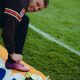 Vor dem Spiel wanderte ich auf Motivsuche durch das Stadion an der alten Försterei, als ich Benedikt Pliquett am Rand des Spielfelds sah. Er band sich gerade die Schuhe zu. Der Farbkontrast zwischen seinen pinkfarbenen Schuhen, der orangenen Werbeplane und dem grünen Rasen fand ich interessant.