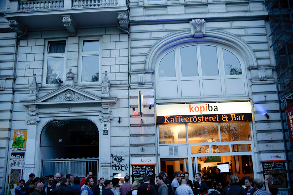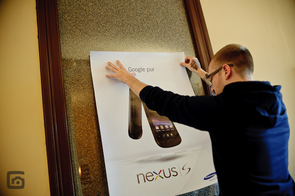 Ganz davon abgesehen, ist die D200 doch zu alt, um bei schlechteren Lichtbedingungen wirklich gute Aufnahmen zu machen – daher wird der Film irgendwann ziemlich rotstichig. Außerdem war das Wetter viel zu gut und die meisten Leute waren eh draussen. Schaut einfach mal, wie voll der Raum nach ca 46 Sekunden wird – da sind nämlich alle kurz im Raum, in der Hoffnung ein Samsung Nexus S zu gewinnen.